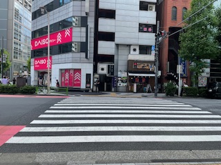 ②地上へ出ると正面にDaisoがございます。交差点は横断せず右に曲がり、人形町通り/水天宮通りを小伝馬町駅方向に向かってお進みください。